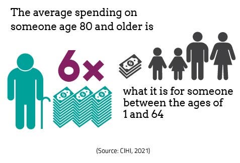 According to CIHI - Canadian Institute for Health Information, the average spending on someone age 80 and older is 6 times higher than people ages of 1 - 64!