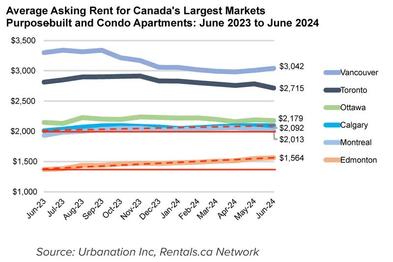 Notice the slope for Edmonton rent growth (bottom dotted red line) is steeper than Calgary (upper dotted red line)? That’s how the gap is starting to narrow.
