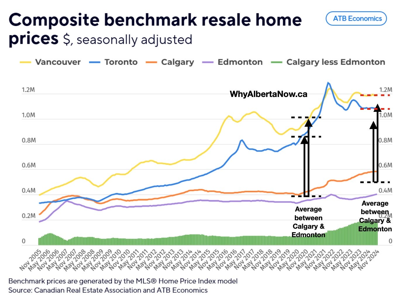 Interesting enough, even today, with Alberta real estate as the "shining star" in the Canadian real estate market, the price "gap" between Vancouver/Toronto is larger in November 2024 than November 2020.