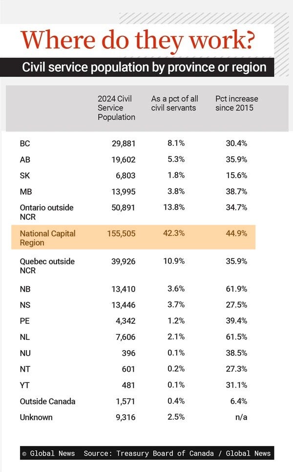 As a percentage increase, the increase of public sector employment from the Federal government is across the board for most Provinces.
